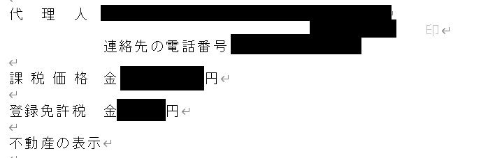要は、相続人本人じゃなくて別の人が申請書を提出する場合は、ここに記載します。(登記申請書内にある課税価格の上に書き足しました。)